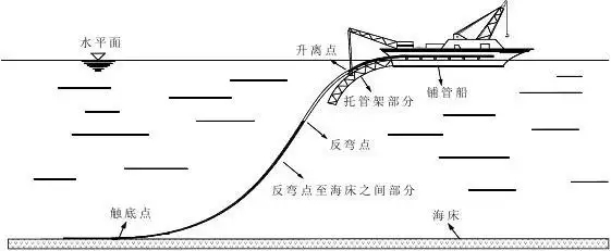 目前海底管道鋪設(shè)技術(shù)中應(yīng)用最多的方法就是S型鋪管法,這種方法一般要安排艘起拋錨拖輪或者多艘起拋錨拖輪來(lái)支持鋪管,工程在展開(kāi)之前,需將一個(gè)錨定位在海床上,然后將錨纜引過(guò)托管架并系到第一根管子的端口,通過(guò)托管架的支撐,它會(huì)自然的彎曲成“S”型曲線。如圖2所示。根據(jù)受力點(diǎn)的不同,可分為三個(gè)區(qū)域,即上彎段、中間段、下彎段。上彎段一般是從鋪管船上的張緊器開(kāi)始向下延伸到管道脫離托管架支撐為止;下彎段是從拐點(diǎn)到管線在海床泥面的著地點(diǎn)這段區(qū)域;中間段一般較短,即上彎段和下彎段之間的部分。目前,S型鋪管技術(shù)可使用多條作業(yè)線進(jìn)行管線預(yù)制,需要一個(gè)托管架,具有多個(gè)焊接站,隨著水深的增加,托管架長(zhǎng)度會(huì)增加、張力也會(huì)增大,但它的穩(wěn)定性會(huì)減弱、風(fēng)險(xiǎn)也會(huì)增加。