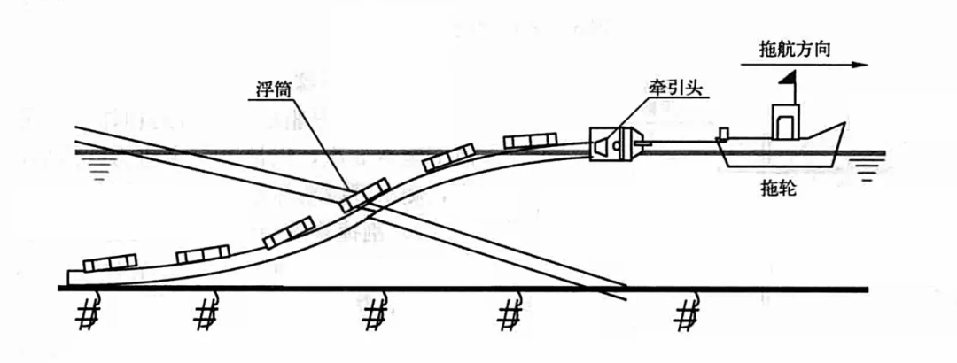 ①浮拖。浮拖主要應(yīng)用于海面風(fēng)浪較小的海域,指的是利用浮筒來(lái)調(diào)節(jié)管道浮力使其漂浮在水面上,然后用大馬力主拖輪牽引管道首端沿既定路線航行,尾拖輪牽引管道尾端控制其橫向漂移以保證管道安全。它受海水流速、管道尺寸、拖輪大小等因素限制,每次浮拖的管道長(zhǎng)度在幾百米到幾千米范圍內(nèi)不等。