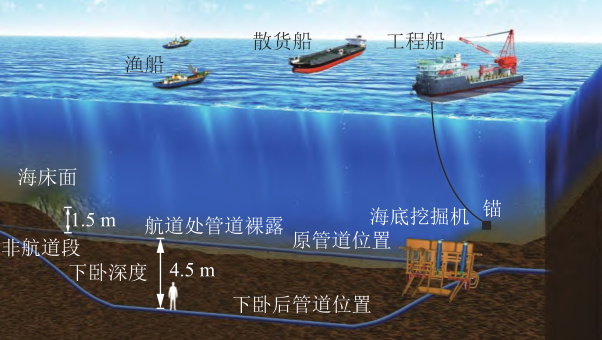 中國(guó)海底油氣管道事故應(yīng)急處置及維保體系得到全面建設(shè)與完善,大深度海底挖掘機(jī)、重力式常壓干式艙等用于事故處置、維修、保護(hù)的系列創(chuàng)新發(fā)明裝備面世并成功應(yīng)用,海底管道水下維修等系列國(guó)家工法與標(biāo)準(zhǔn)體系已經(jīng)構(gòu)建形成。在渤??绾降篮5坠艿啦煌.a(chǎn)施工中,解決了硬質(zhì)海床條件下在役管道整體下臥4.5m的技術(shù)難題,使跨航道海底管道得到有效保護(hù)(圖10)。有效攻克了泄漏海底管道應(yīng)急封堵、水下濕式不停產(chǎn)搶修、中深水犁式挖溝等關(guān)鍵技術(shù)和裝備,并得到工程應(yīng)用,實(shí)現(xiàn)了中國(guó)全海域海底管道事故的快速處置。近10年來(lái),中國(guó)已成功處置各類海底管道受損事故31起,有效保護(hù)了海洋生態(tài)環(huán)境。